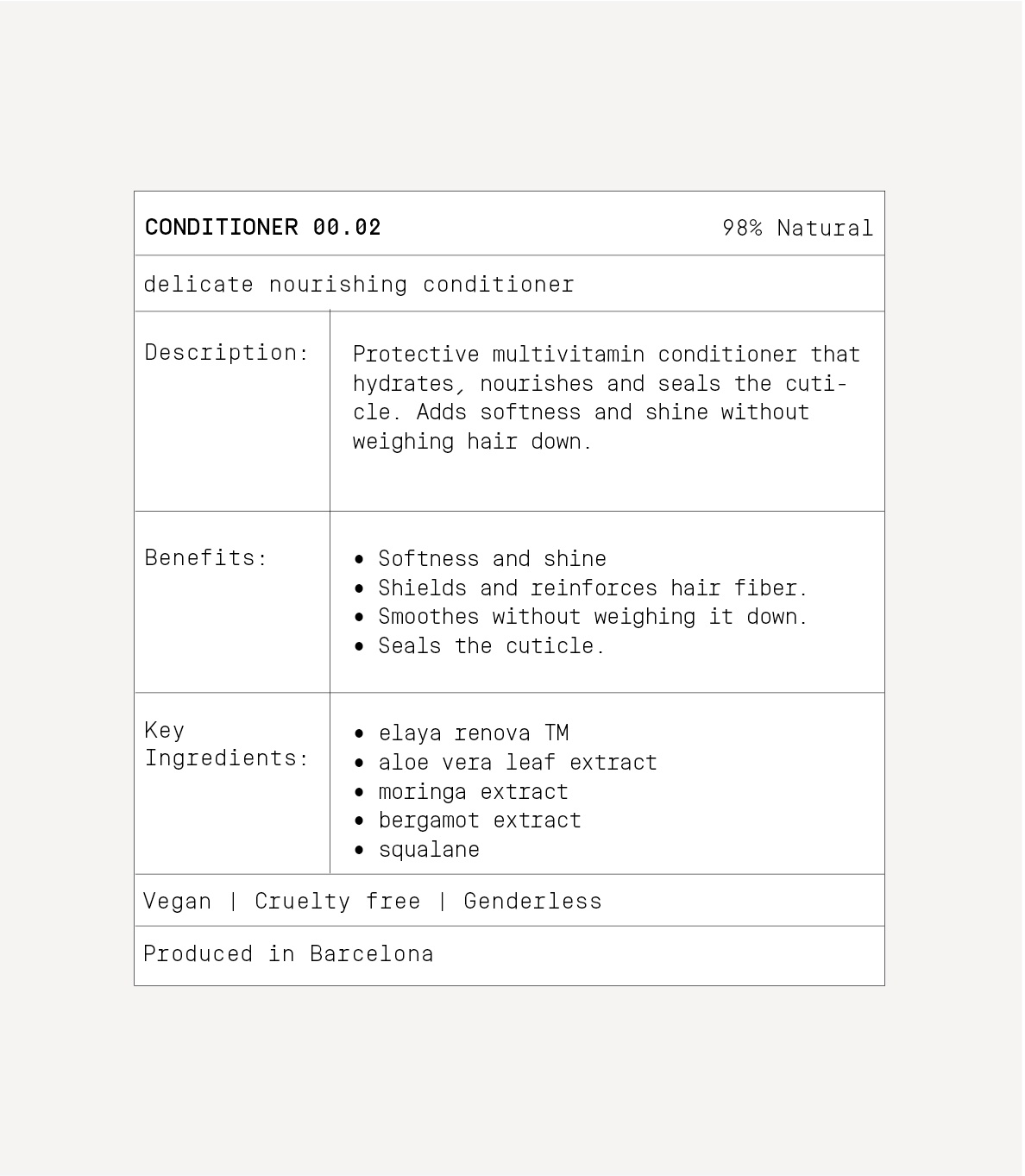 Conditioner 00.02 bestaat voor 98% uit natuurlijke ingrediënten, waaronder voedende plantenextracten en essentiële oliën voor gezond, sterk en glanzend haar.