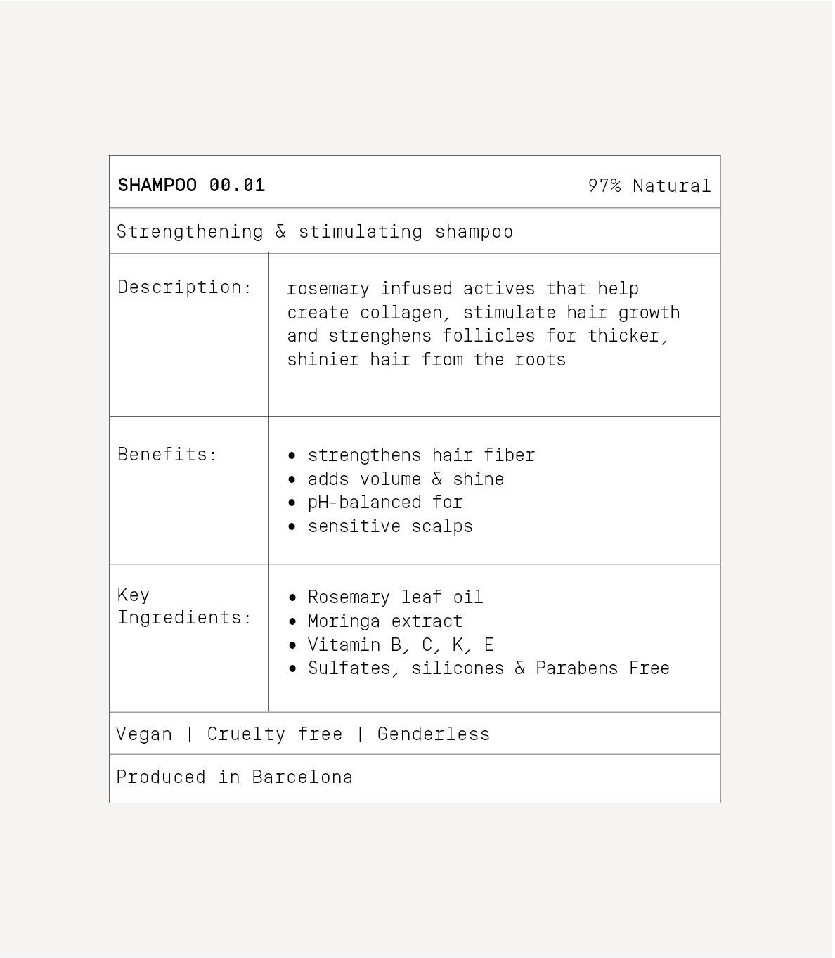 Versterkende en stimulerende shampoo met rozemarijnbladolie, moringa-extract en vitamine B, C, K, E om de haargroei te stimuleren, de follikels te versterken en volume en glans toe te voegen. 97% natuurlijk, vrij van sulfaten, siliconen en parabenen.
